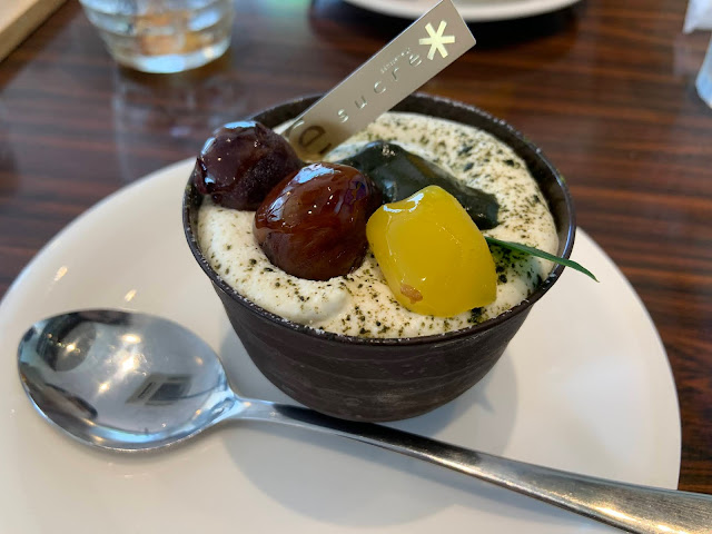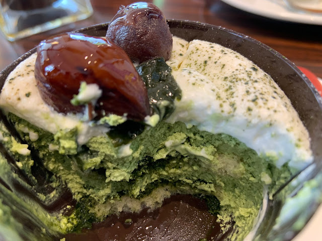 上に粒餡・栗2種、抹茶パウダー、生クリーム、抹茶マスカルポーネ、スポンジ、抹茶わらび餅(ゼリーというよりもちもちしてました)