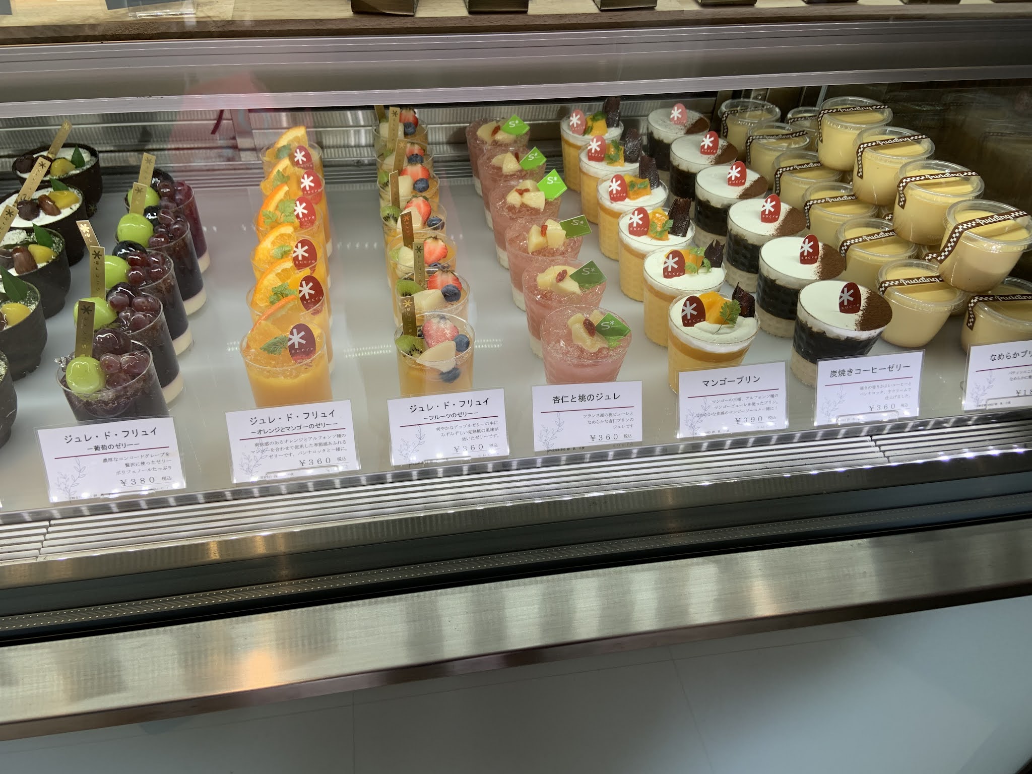なめらかプリン・炭焼きコーヒーゼリー・マンゴープリン・杏仁と桃のジュレ・フルーツゼリー・オレンジとマンゴーのゼリー・葡萄のゼリー・抹茶のティラミス